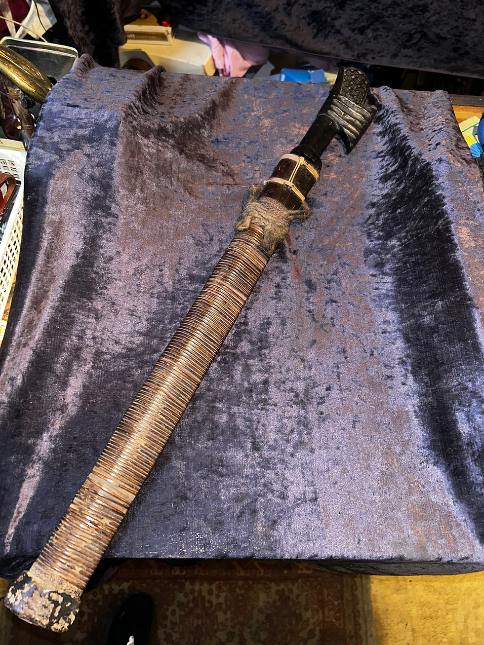 Sv cavalry saber w/1893 but without markings only 99 or 66 on the blade. May have been used in Finland during the War of Independence in 1918 when the Swedish brigade's arms were stripped of Sv emblem and text. Wide blood groove points to early manufacture so even there a hint. Damaged leather on the gripp otherwise in normal used condition. Tub in blackened steel, marking on this K7. Length 109-110cm (309eur)